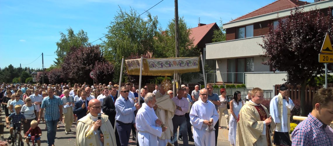 W czwartek 15 czerwca obchodziliśmy uroczystość Najświętszego Ciała i Krwi Pana Jezusa. Po uroczystej Mszy św. pod przewodnictwem neoprezbitera ks. Przemysława Przyślaka przeszlismy ulicami naszej parafii w procesji eucharystycznej do czterech ołtarzy, by w ten sposób uczcić Jezusa ukrytego w Najświętszym Sakramencie.