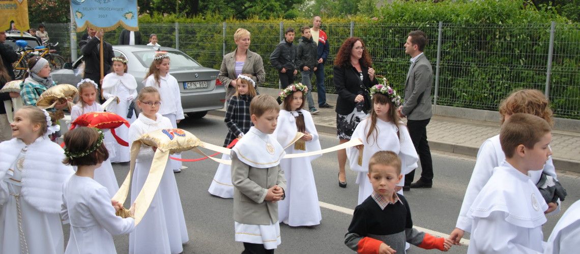 30 maja (czwartek) o godz. 10.00 była Msza Św. Dlaczego była w czwartek? Czemu nie szliśmy do szkoły? Czemu nasza miejscowość była tak wystrojona? Było po prostu święto Najświętszego Ciała i Krwi Pana Jezusa! (Ludzie nazywają to święto Świętem Bożego Ciała). Już wcześniej kościół był wypełniony ludźmi. Dla dzieci sypiących kwiaty i dzwoniących dzwoneczkami zarezerwowano pierwsze ławki. Mimo to kilkoro dzieci siedziało na klęczniku przed ołtarzem. Kiedy wszyscy weszli do kościoła rozpoczęła się Msza Św. Po połowie obrzędów wstępnych jedna z dziewczynek powiedziała wiersz na powitanie księdza prymicjanta. Następnie wraz z chłopcem wręczyli księdzu kwiaty. Po zakończeniu Mszy Świętej wszyscy wyszli na zewnątrz. Zaczęła się procesja Bożego Ciała. Procesja zaczęła się nieciekawie – padał deszcz. Ale deszcz nie zraził wiernych z naszej parafii. Na przedzie szły dzieci z poduszkami. Zaraz za nimi szły dziewczynki z kwiatkami. W ich towarzystwie maszerowali chłopcy z dzwonkami. Potem sztandary i za nimi ksiądz z Monstrancją, a w niej Pan Jezus. Obok dzieci i sztandarów szli dorośli. Gdy doszliśmy do ul. Brzozowej zobaczyliśmy pierwszy, śliczny ołtarz wykonany przez parafian z Bielan. Po głośnym odczytaniu Ewangelii ruszyliśmy dalej. Przed wejściem do szkoły na ul. Akacjowej był drugi ołtarz. Tak samo śliczny jak poprzedni, lecz inny. Pomaszerowaliśmy dalej. Następnie trzeci, czwarty i jak lunęło! Tak! Jakby żaby z wodą spadały z nieba! Potem procesja się zakończyła i wszyscy poszli do domu.