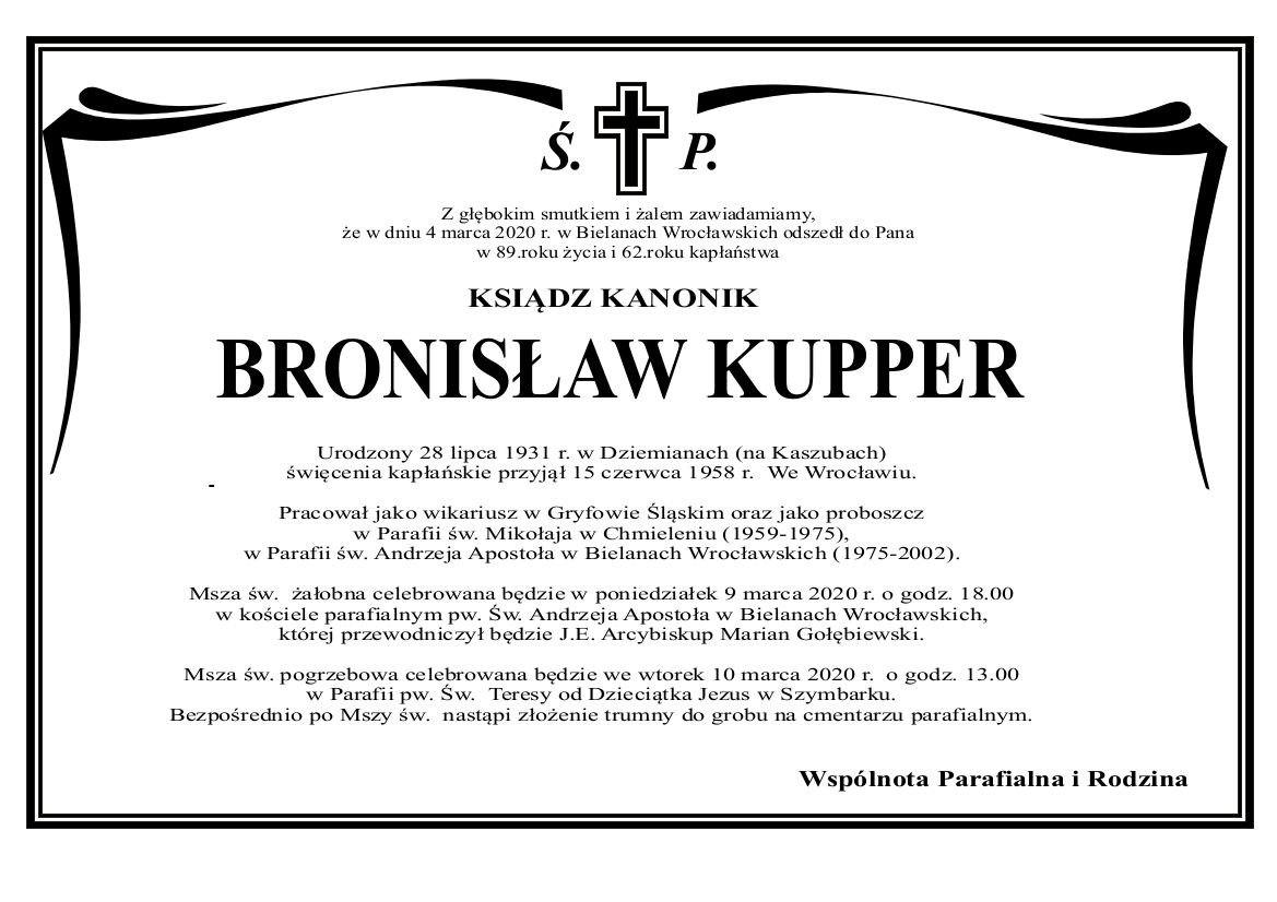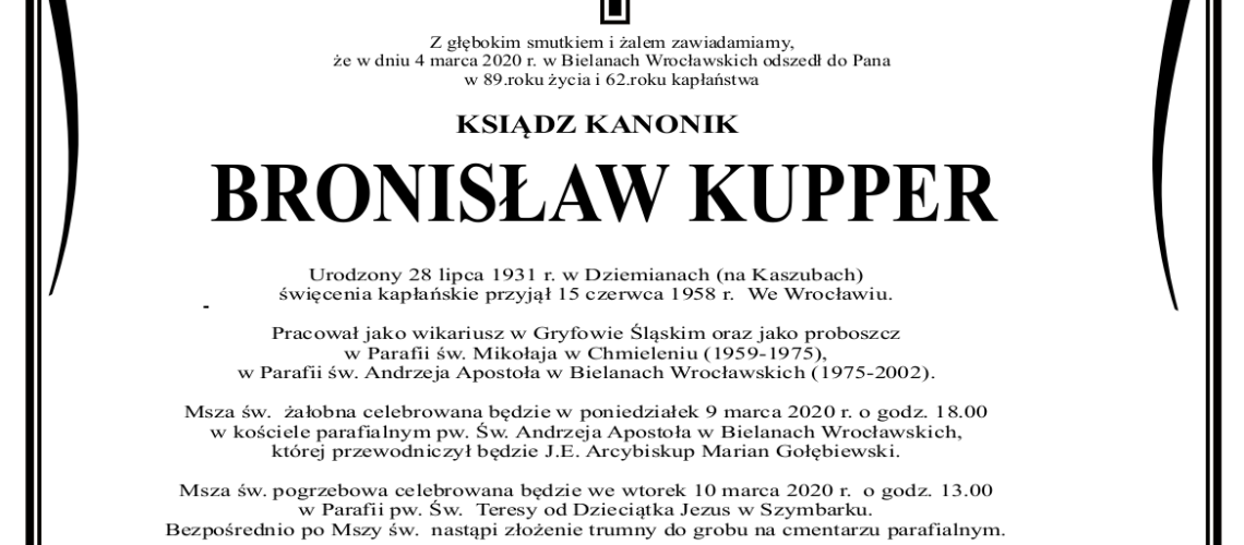 W dniu 4 marca odszedł do Pana ks. kanonik Bronisław Kupper.